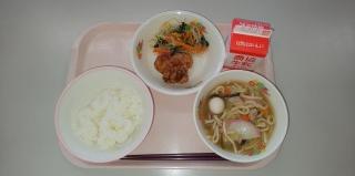 お腹がペコペコになったら給食です!今日はご飯にフライドチキン、もやしのナムルにちゃんぽん麺でした。しっかり食べていましたよ。