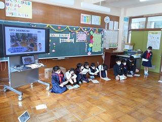 3年生児童の作った物語は、「12人の兄弟のぼうけん」です。12人の魔法使いの兄弟が、家からぬすまれた宝石をさがして冒険をする物語です。12人の兄弟の名前は月の名前、魔法の言葉は誕生石や月の花、そして、出会う動物たちは、十二支と工夫がいっぱいの物語でした。パソコンで作った絵も画面が動き、たいへんきれいで、全校のみんなは、すぐに物語に引き込まれてしまいました。