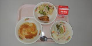3日目の今日はかほくの献立で、パン献立でした。かほっくりごまロール、鶏肉のハーブ焼き、れんこんサラダ、そしてねぎと大根のクリーム煮です。かほく市の大崎でとれたほっくほくのさつまいもとごまを練りこんだ優しい甘さのかっほくりごまロール。河北潟の大地で育ったれんこんを使用したサラダ。大きく切ったねぎと大根をやわらかく煮込んだクリーム煮を、子供たちはしっかりと味わっていましたよ♪