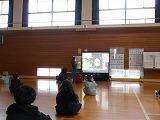 体育館に向かう通路前では、集会で発表したお話をモニターで紹介していました。