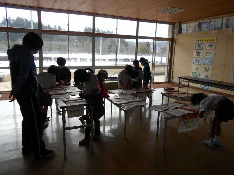 展示室には自学ノートが学年ごとに並べられていました。どのノートも力作ばかりでした。さっそく1,6年生たちがコメントを書いていました。すてきな学び合いの場になっていました。