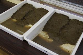 パッドの箱に土を入れ、水を流す実験をもとに考えました。水を少なく流した時と多く流した時の結果を比較しました。