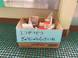 給食の牛乳パックは、捨てずに洗ってリサイクルボックスに入れます。今まで給食後のゴミ袋は牛乳パックでいっぱいでしたが、たくさんの人がリサイクルし、ごみが少なくなりました。