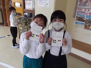 4年生手作りのカードを一人ひとりもらい、『給食完食』、『節水』、『節電』、『リサイクル』ができたらシールを貼っていきます。カードの取組期間は3日間で、今日が最終日でした。