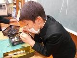 カッターを使って、まゆの端を切り、中に鈴を入れました。難しいかなと思っていたけれど、自分で育てたカイコだからかな。がんばって作っていました。