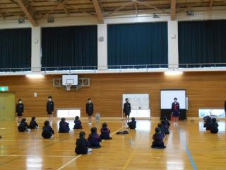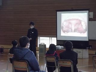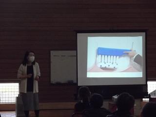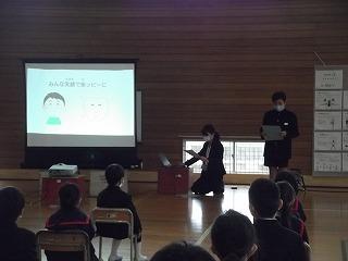 1つ目はすこやか集会です。全校で歯の健康について考えました。健康委員会のはぎのっ子の歯についての紹介のあと、歯科衛生士の松本さん、町保健師の東さんから歯についてのお話をお聞きしました。