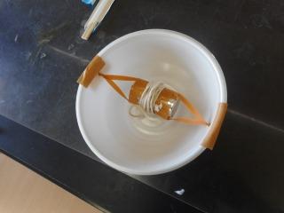 中の構造です。材料は、カップ麺のカップ、ゴム、電池、タコ糸、割りばしです。 |