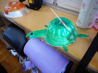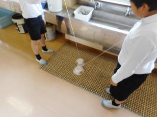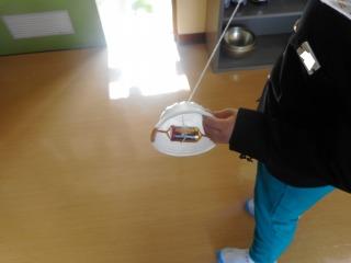 3年生は、3限目の理科の時間に、「風やゴムで動かそう」という学習を生かして、ゴムの力で動くおもちゃを作りました。電池につけたたこ糸を引っ張ることにより、ゴムがたくさん巻かれ、そのゴムが戻ろうとする力を利用して動くおもちゃです。