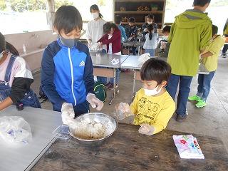 まきまきパン作りでは、パンの生地をみんなでこねたり、
