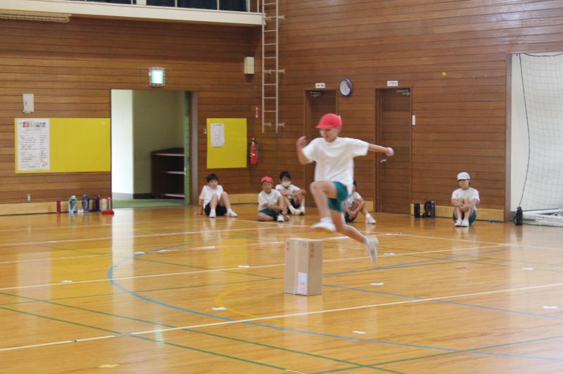 リズムよく跳ぶために、段ボールをハードルに見立てて飛び越えました。