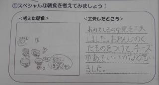本校の栄養士の先生から、朝食を食べると「体スイッチ」「頭スイッチ」「お腹スイッチ」の3つのスイッチが入ること、いい朝食は、「温かいもの(作りたてのもの)」「3つの色の食べ物がそろっていること」を教えていただいた後で、自分なりに「スペシャルな朝食!」を考えました。先生からのアドバイスで、朝は時間がないこともちゃんと考えて作っている子が多かったです。
