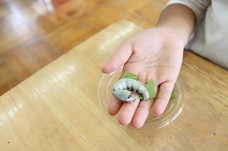 1年生の教室では、うれしそうに、大きくなったカイコを手の平にのせて見せてくれました。