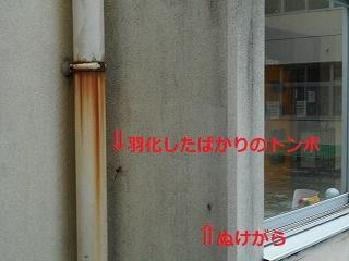 3年生が、羽化して間もないトンボを見つけ、知らせてくれました。たしかに、まだ、ヤゴ(幼虫)のときのぬけがらの上に、トンボがいました。カメラをもって近づくと、ぬけがらから離れてしまいました。校舎の壁には、たくさんヤゴのぬけがらがあります。