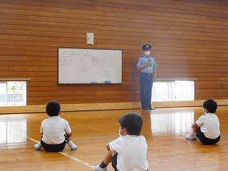 体育館で、津幡警察署の方からお話を聞きました。学校以外の場所で気を付けることも教えていただきました。「不審者はマスク・サングラスをしているとは限らない、一人でいるとねらわれやすい、<いかのおすし>を守ること」などを教えていただきました。