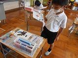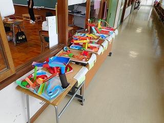 3限目、3年生が理科の時間にゴムを使って車を走らせました。「ゴムを伸ばす長さを変えて車を走らせたらどうなるだろう?」、「紙の帆を付けたほうが遠くまで進むのかな?」と考えながら走らせていました。
