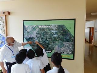 まず、職員室前の津幡町航空写真を見て、校区の様子を確認しました。