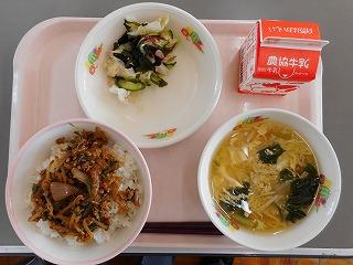 今日の給食は、「肉みそ丼、海そうサラダ、麦ごはん、かき玉汁」でした。特に、肉みそ丼をもりもりおいそしそうに食べていました。