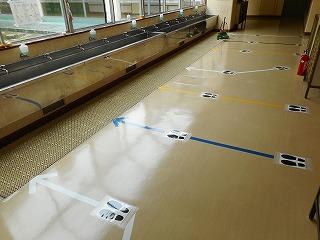 3か所ある手洗い場に「足型」をつけました。ソーシャルディスタンスをとるためです。足型がないところでも、順番に並ぶときは、常にソーシャルディスタンスを意識できればと思います。