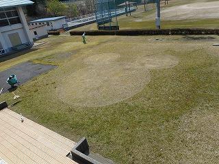 校舎と運動場の間に、謎の円形の模様があります。1階や近くで見てもなかなかわかりませんが、2階から見るとよくわかります。