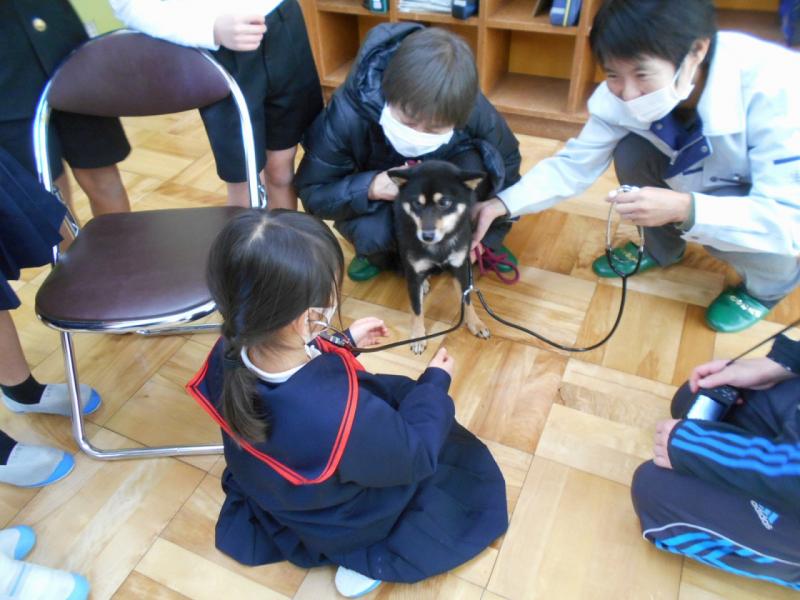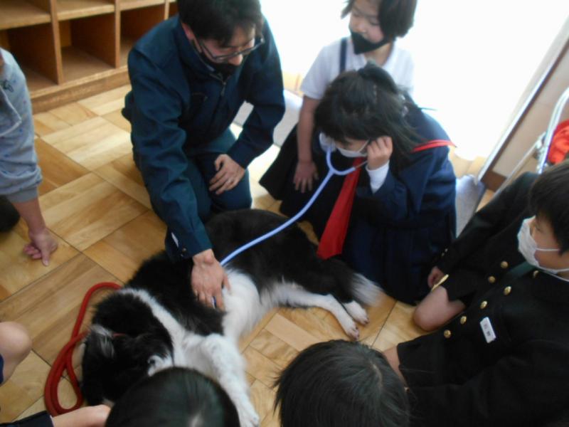 「かわいい!」「あったかい!」と言いながら、触らせてもらったり、一人一人、心臓の音を聴かせてもらったりして、命があることを実感していました。