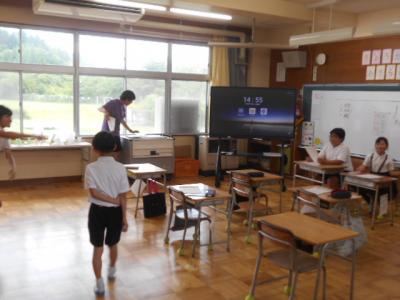 避難訓練の後、みんなが靴の泥を落とした後の玄関を、きれいに掃除してくれる6年生。