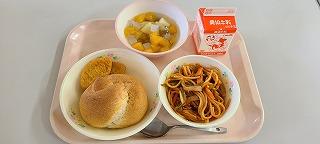胚芽パン、チキンナゲット、スパゲティー、フルーツカクテル、子どもたちはどれも競争するかのように