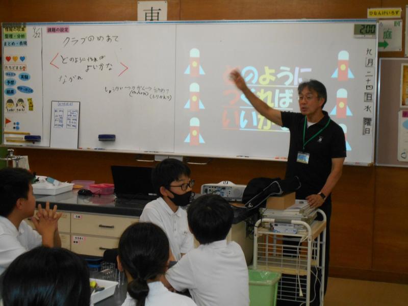 9月のクラブ活動は科学でした。シグナスにあるこども科学館の科学教育専門員 岡田秀さんをお招きしてロケットづくりをしました。