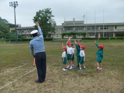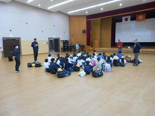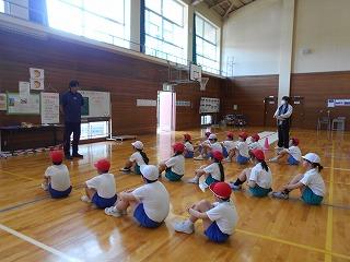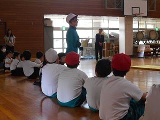 晴天の下、運動場で1年生と4年生の交通安全教室がありました。