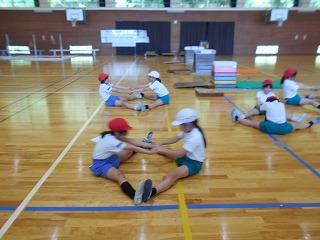 今日は笠野小学校で、3校合同器械運動交歓会練習が行われました。笠野小の先生から器械運動に合わせた準備体操を教えていただき、笠野、刈安の友達ともペアをつくって準備運動を行いました。
