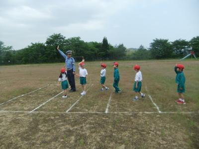 1年生は安全について説明を聞いた後、運動場に作られた道路を歩きながら、横断歩道の渡り方を中心に学びました。