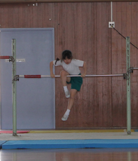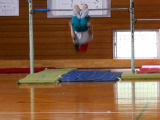 1つ目に、鉄棒でこうもり振り降りや足掛け回りを披露しました。
