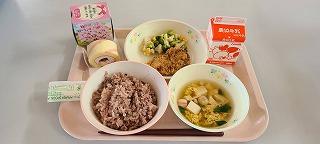 献立は、赤飯、トンカツ、はなやさいサラダ、かきたまじる、お祝いデザートです。