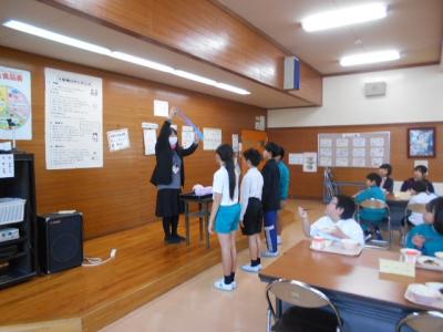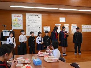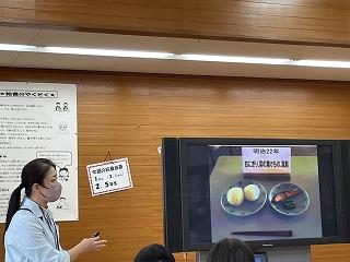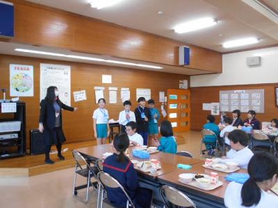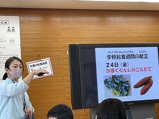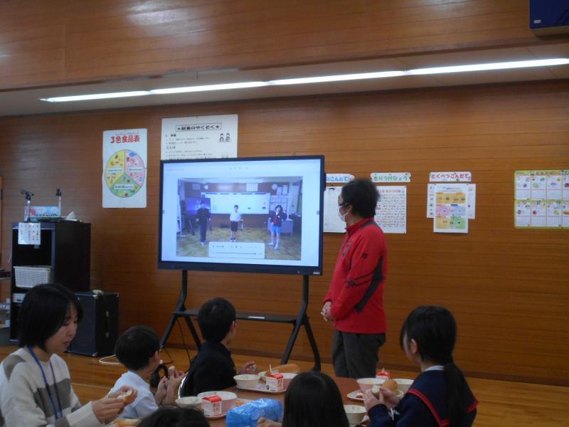 先週の24日の給食時間、栄養教諭から給食のはじまりについてや、学校給食週間中の特別献立の説明がありました。