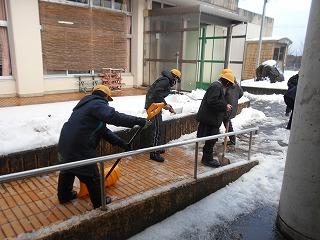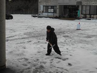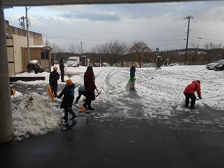 昨日から降り積もった雪が水分を含んでいる中、6年生を中心に登校してきた児童が雪かきをしてくれました。