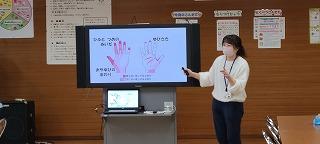 計測後、養護教諭の冨田先生から手洗いについてお話を聞きました。