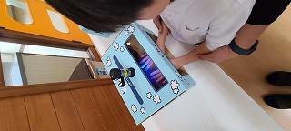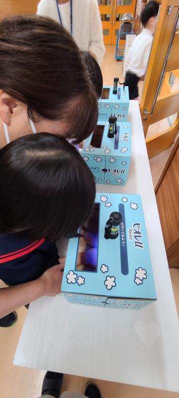 さまざまな感染症が流行るこの季節における手洗いの大切さを教わった後、実際にどれくらいきれいに洗えているかみんなでチェックしました。