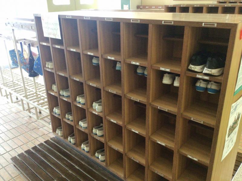 下足箱にきれいにズックが入っています。落ち着いてかかとをそろえて下足箱に入れる萩野っ子のみんなの姿がありました。
