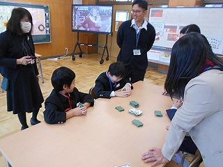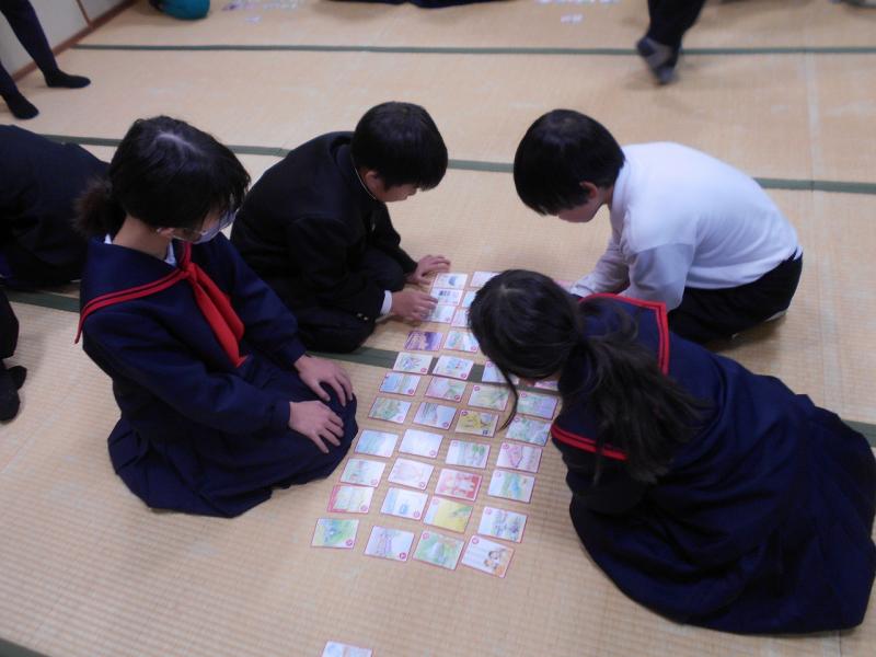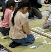 かるたのルールについての説明があり、2人1組になって対戦しました。1枚の札に2人同時に手を付けた時の判定については、正式には審判の方が判定することになっているそうです。今日は上手にじゃんけんをしたり譲り合ったりして札をとっていました。