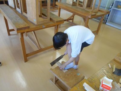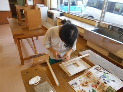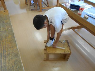 4年生は、木を切ったり組み合わせたりして感じたことや想像したことから、表したいことを見つけていました。