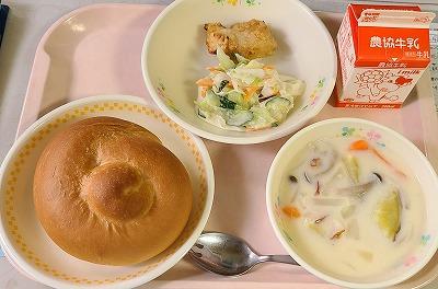 今日の給食は「ミルクロール、鶏肉のマーマレード焼き、コールスローサラダ、秋野菜のチャウダー」でした。