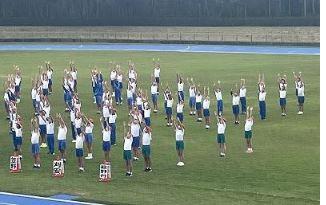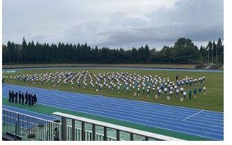 津幡町の小学校6年生が津幡運動公園陸上競技場に集まり、友好の輪を広げ、自己の体力を高めました。