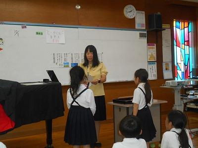1年生の音楽の時間、鍵盤ハーモニカの先生をお招きして、演奏の仕方を教えてもらいました。