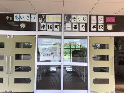 萩野台小学校の玄関には、「あいさつ、えがお、そうじ 津幡町 一番の学校」という掲示があります。