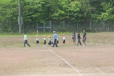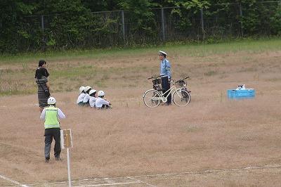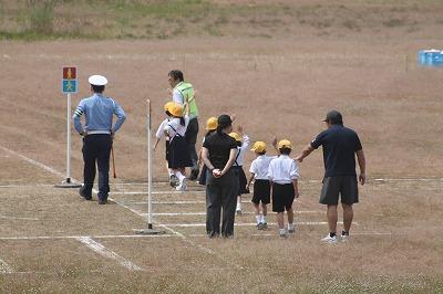 1年生は運動場に作られた道路を歩いて安全について説明を聞きます。