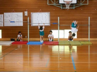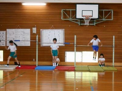 また、体育館では鉄棒をしている児童がたくさんいます。