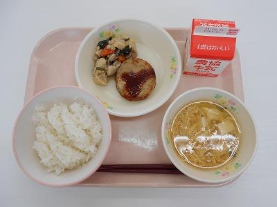 れんこんハンバーグ、治部煮風、ふかしのかきたまじる、ごはん、牛乳です。