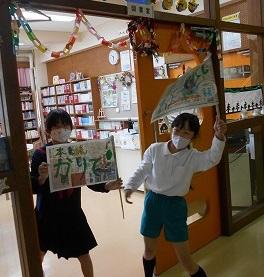 かわいい旗を作って、「本を借りて~」と呼びかけている児童もいました。