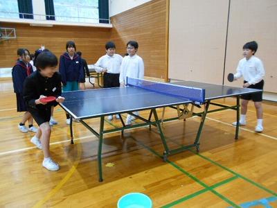 休み時間になると、体育館の卓球台の周りにはたくさんの子ども達がやってきます。