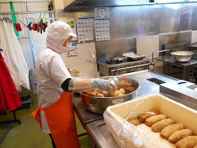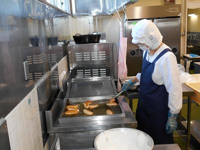 給食室では、朝から調理員さんが一生懸命揚げパンを作ってくれていました。
