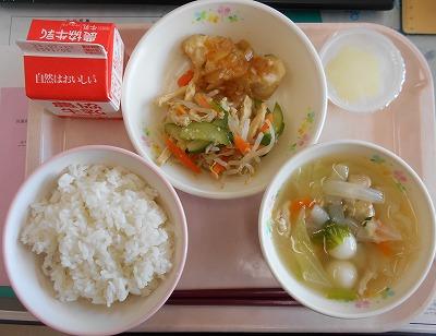 【ごはん、牛乳、ホキのピーマカ風、もやしときゅうりのごま酢和え、ダンプレン、レモンゼリー】